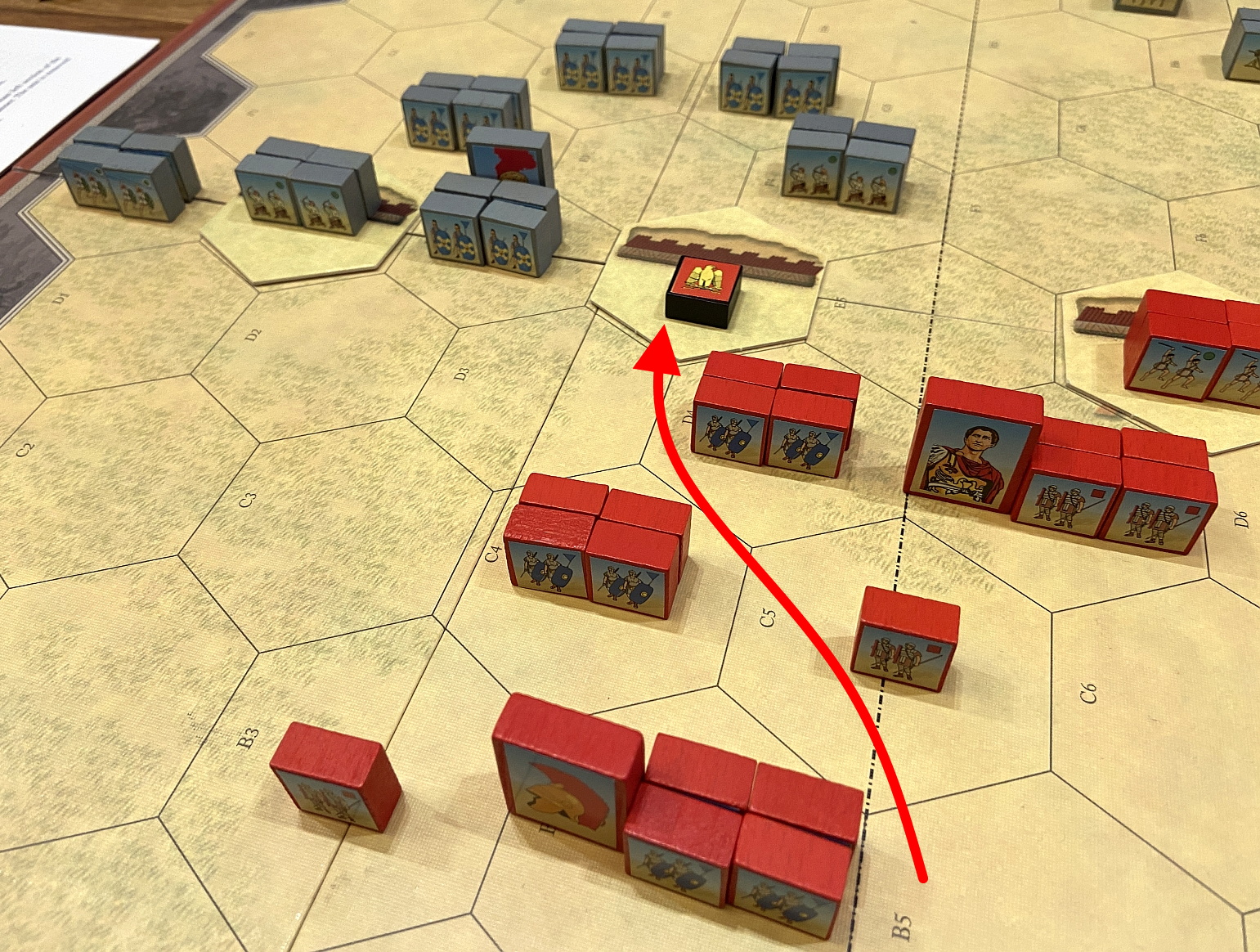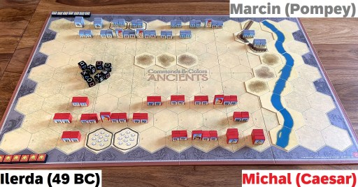 We started with Illerda – from a game perspective a very interesting set-up (hills in the center giving a VP for Caesar) as well as very bloody – just enlarge below picture and count all the Heavy Infantry units. That would be a decisive and brutal clash, as we also have a Julian Legion rule (each such unit can move up to 2 hexes) and Julius Caesar rule (units with that leader has +1 die and can move 2 hex and battle). We rolled for sides, and Marcin took Pompey while I was given Caesar.