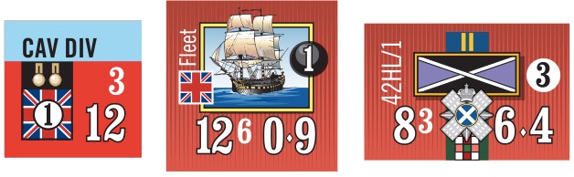 British infantry battalions have a slightly lower movement factor than French and Russian units. The idea here is that the extended linear formations that the British used required considerable alignment, and could be easily disrupted by rough terrain. Rather than adding in lots of special rules to account for all this, it was much easier to reduce in British movement rates.