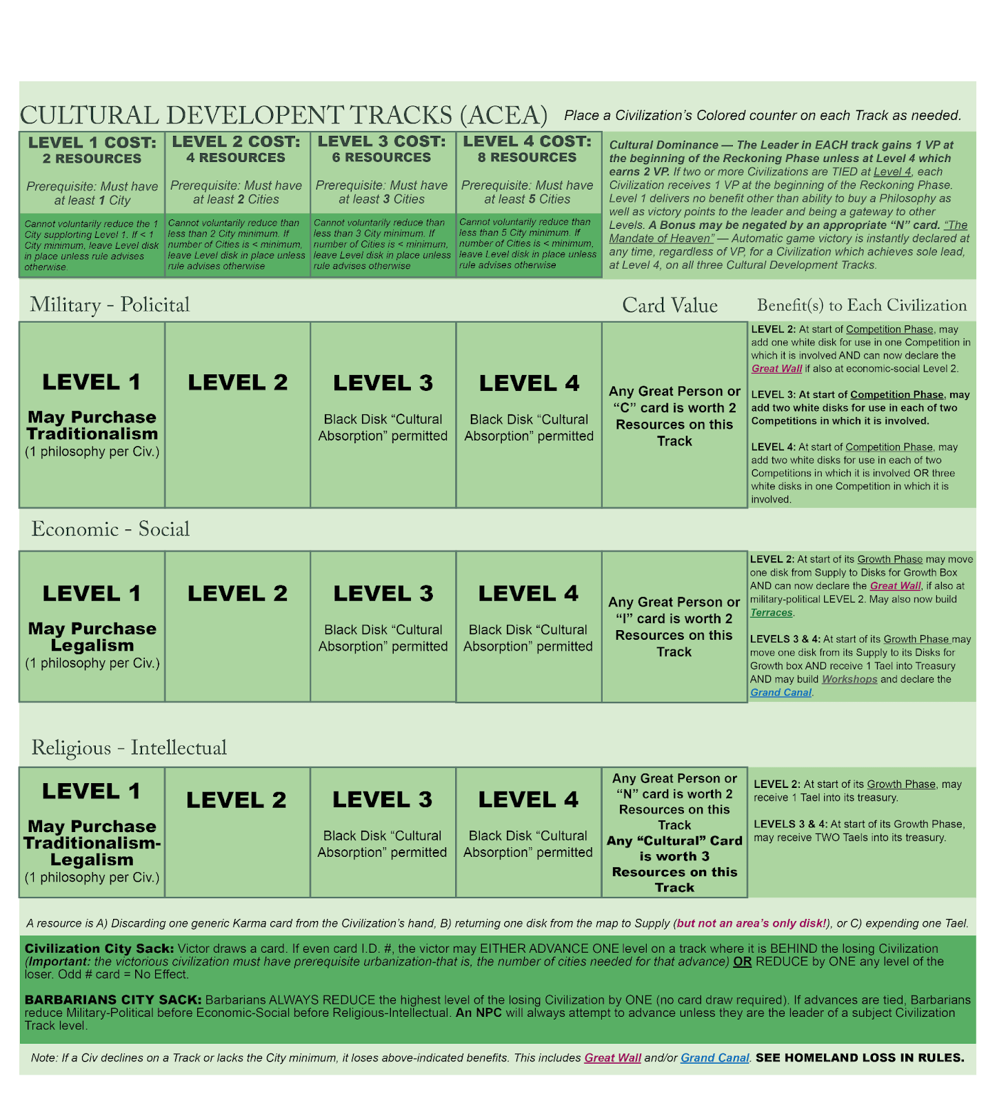 Levels 3 & 4: Other than Level 4 allowing the possibility of a “Mandate of Heaven” Sudden Death Victory for being the sole Civilization occupying all three Tracks’ Level 4 spaces, these two levels allow a Civilization to earn two tael each turn. Either of these also permit use of the Cultural Absorption Rule (see above).