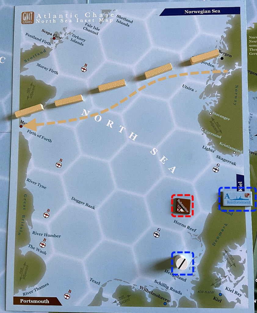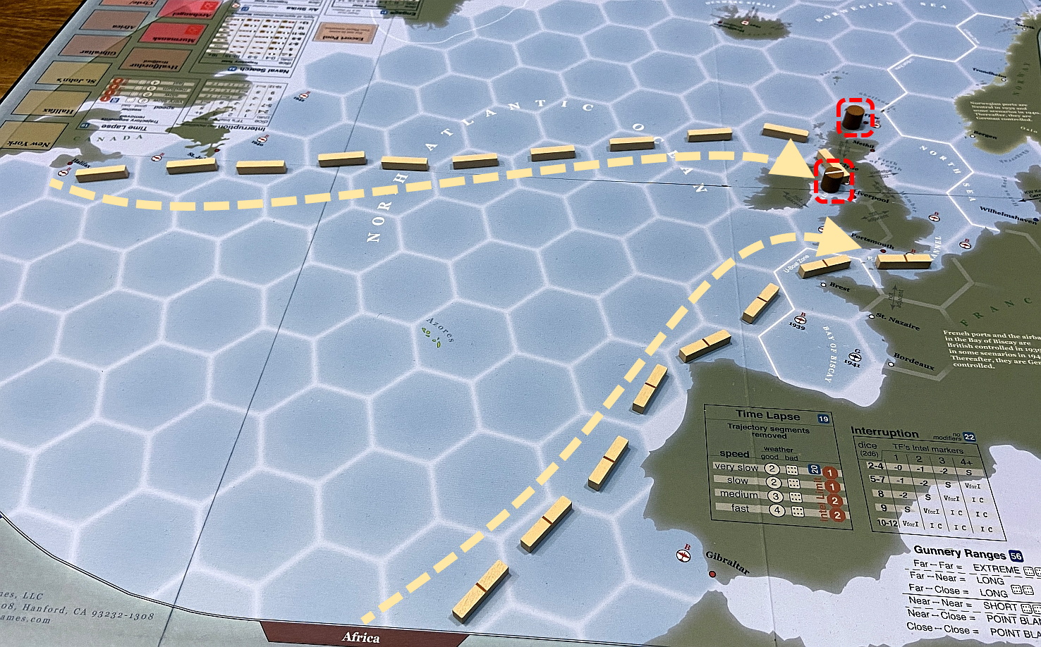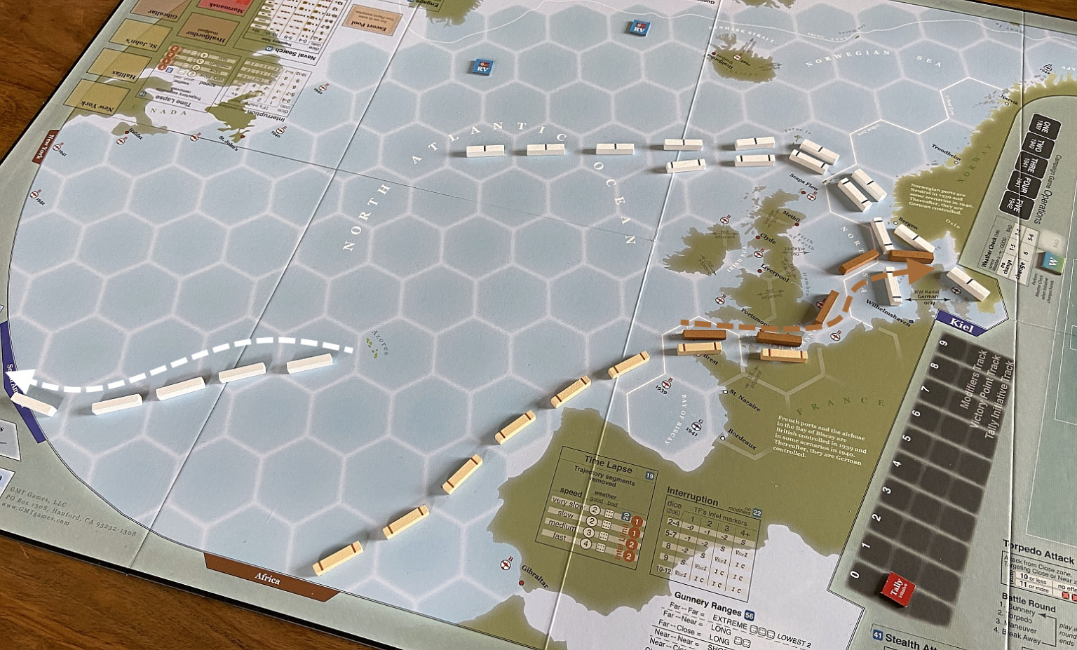 Try as it might, the AI is much better as all-powerful British than Germans, who require a very subtle and intelligent play, having usually much weaker force than Royal Navy. Thus it does not too much long to identify best strategy for convoys. Also, lack of persistent strategy of the main German Unidentified Task Force allowed my convoys to slip and complete in British ports. Maybe the Germans had not developed good coordination between their naval assets yet?