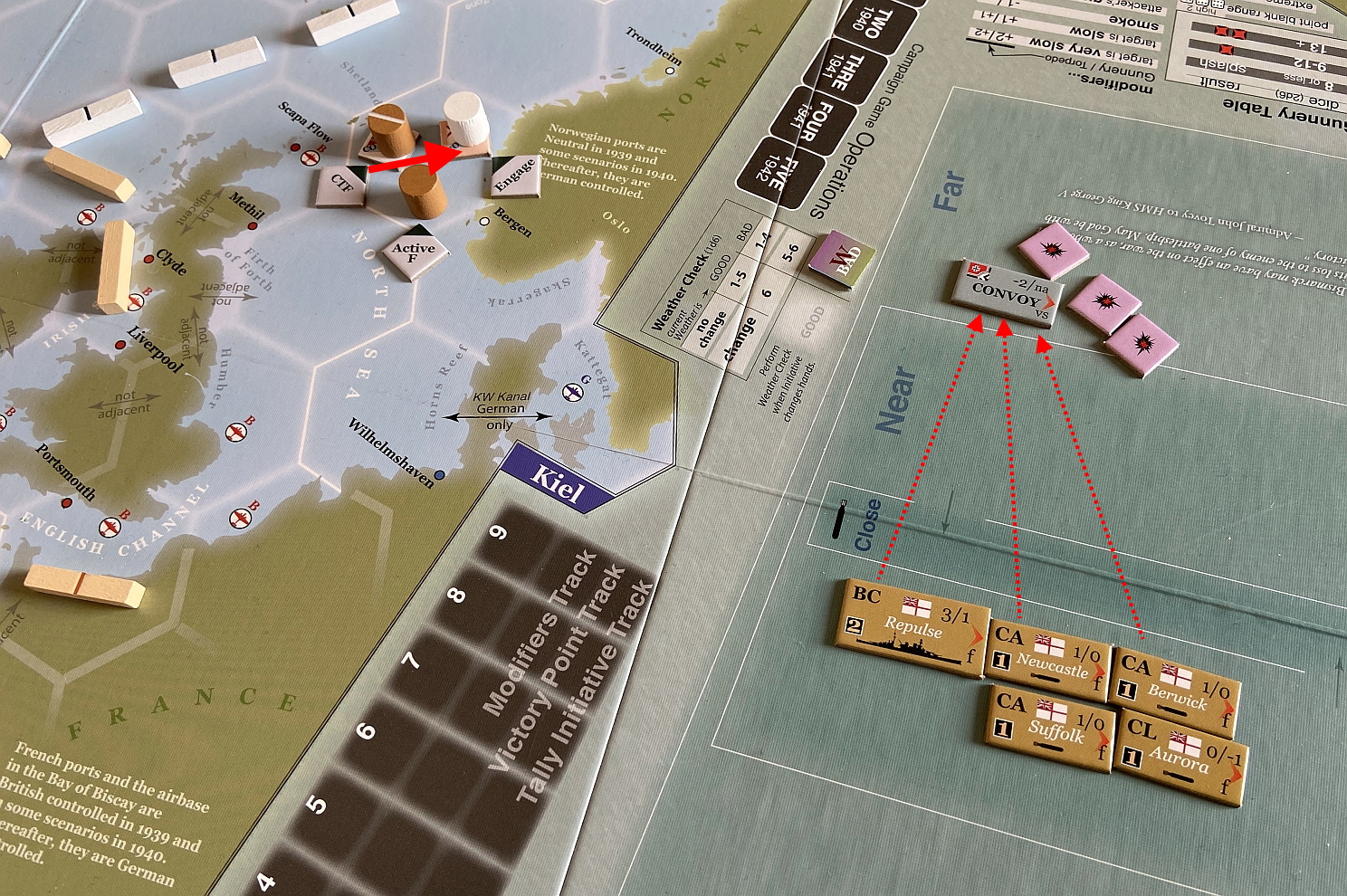 This is the first scenario, a relatively small one where you are equipped with a small German force tasked with initiating raids on the British convoys. Points are scored for damaged and sunk enemy vessels as well as some special actions, which are known as the scenario develops.