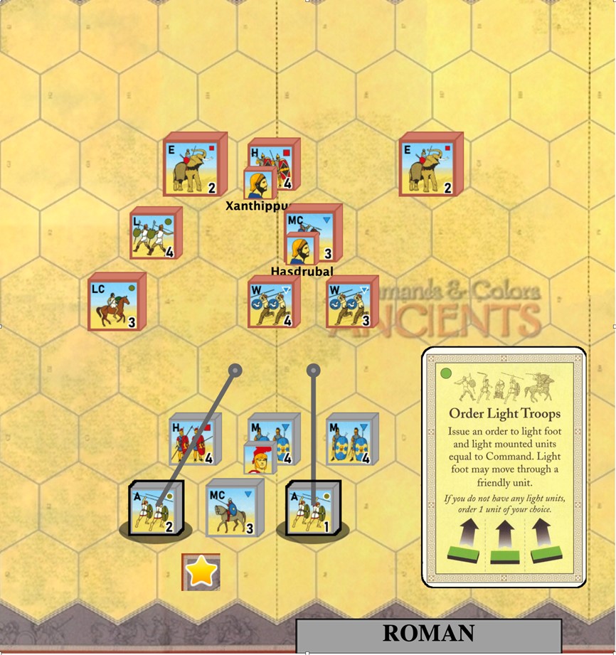 Luckily for Hasdrubal, the first roll by the Roman Medium includes a flag. Hasdrubal takes it and retreats out of range of Nero’s Heavy. It still looks grim but this may give him at least one more turn to pull something out of the bag.