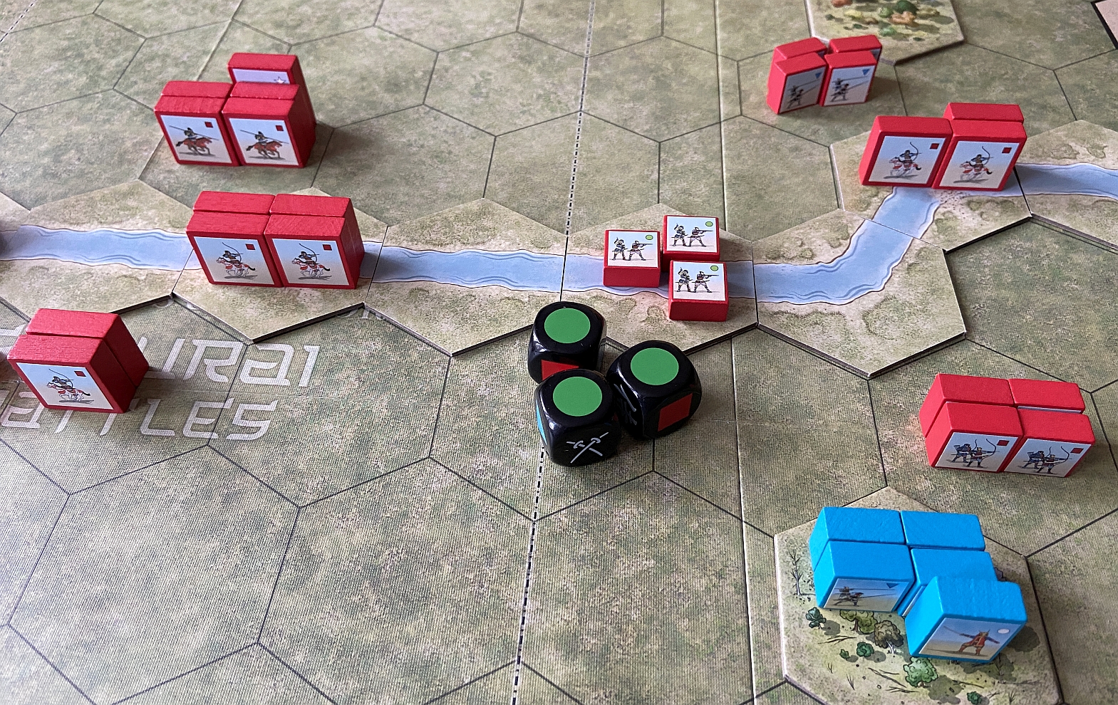 Before we jump into the after action reports, here’s a little more about the game. The Commands & Colors: Samurai Battles game rules allow players to portray important engagements of Japanese history. The battles, included in the scenario booklet, focus on the historical deployment of forces and important terrain features in scale with the game system. The scale of the game is flexible and varies from battle to battle. For some scenarios, an infantry unit may represent an entire clan of soldiers, while in other scenarios a unit may represent just a few brave warriors.