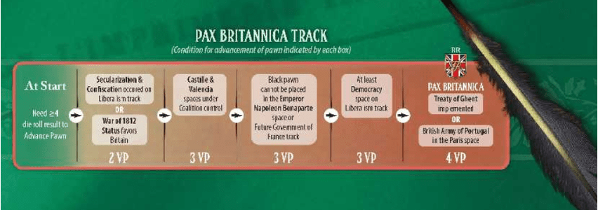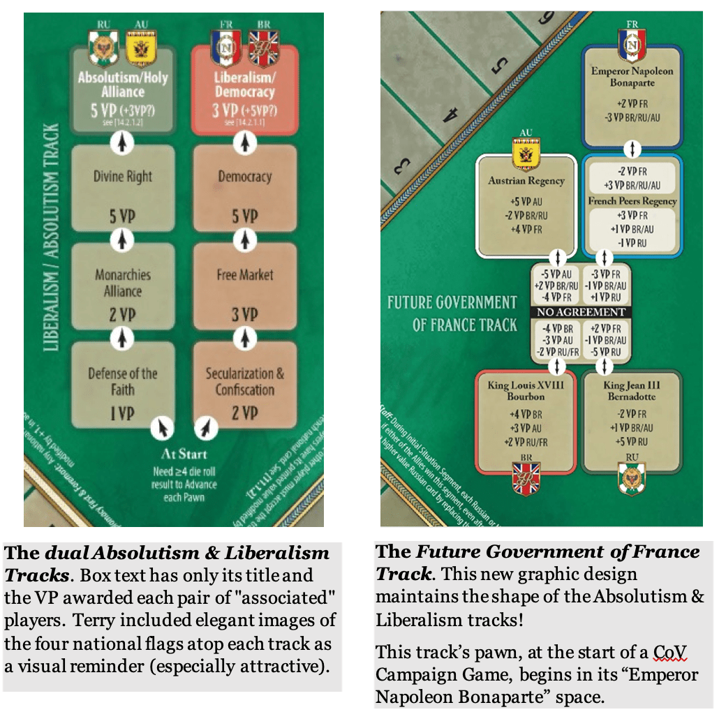 The gameboard features three key tracks: the dual tracked Absolutism & Liberalism, the Future Government of France, and Pax Britannica. These have been stylized and simplified. Furthermore, Terry included each Major Power’s National flag to make it easier to remember which player receives or loses VP when a track’s pawn enters it.