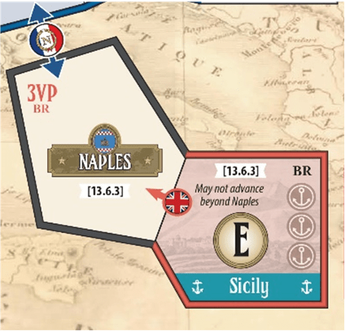 Fortunately, the ever-talented Terry found an excellent and visually very attractive solution. Using the coding “OHR”; he strategically placed a symbol of a “Granada” (which is the Spanish word… it is “Grenade” in English) employing an elegant violet color in the different territories or boxes of the military map where certain optional rules are relevant. This includes a reference to the rule’s case numbering in the CoV Rulebook to facilitate a quick cross-reference.