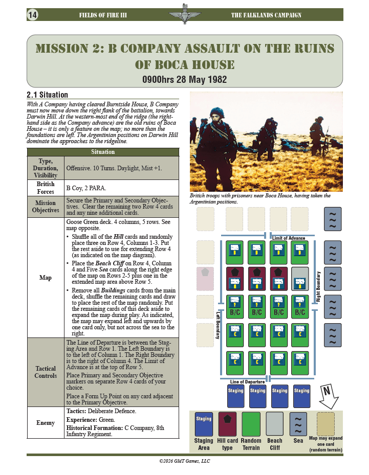 Overall, the Falklands campaign is the closest to the missions in Fields of Fire volume 1 and we recommend this as a good starting point to explore the Parachute Regiment, rather than tackling the campaigns in chronological order. Communications are comparable to the Vietnam campaign, but with additional flexibility in each of the squads (or Sections as they are known in the British army). Each campaign uses its own terrain deck to represent the difference between the flat, almost featureless ground of the approach to Goose Green and the rocky, mountainous terrain of Wireless Ridge.