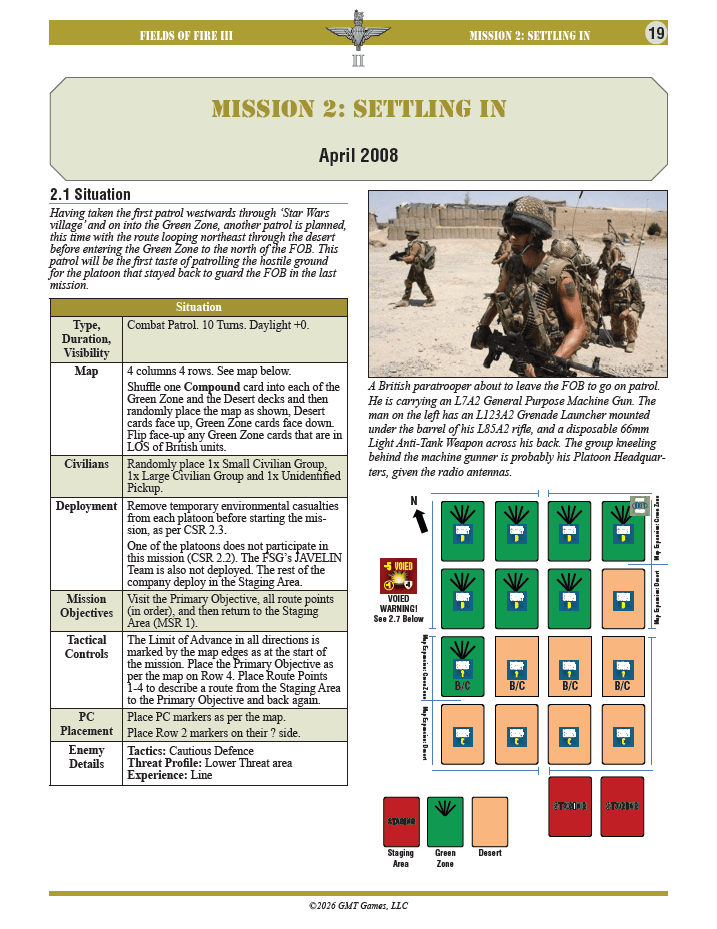 One 8-mission campaign with maps built from two terrain decks representing the desert areas and Green Zone around Forward Operating Base Inkerman where 2 Para were based for 7 months.