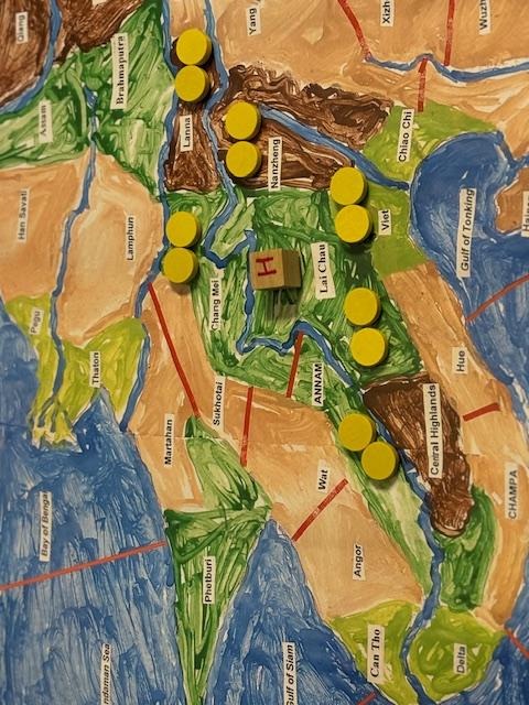 Figure 2: The Dong Son Civilization’s initial placement of disks on ACEA’s playtest map: The “H” small wooden block indicates the Standard Game’s Dong Son Homeland, in this example the Jungle area of Lai Chau (the produced game’s component will be similar to ACME’s Homeland Blocks). Light brown indicates clear Arable areas, dark brown Mountain, light green Fertile, dark green Jungle and, of course, blue represents rivers.