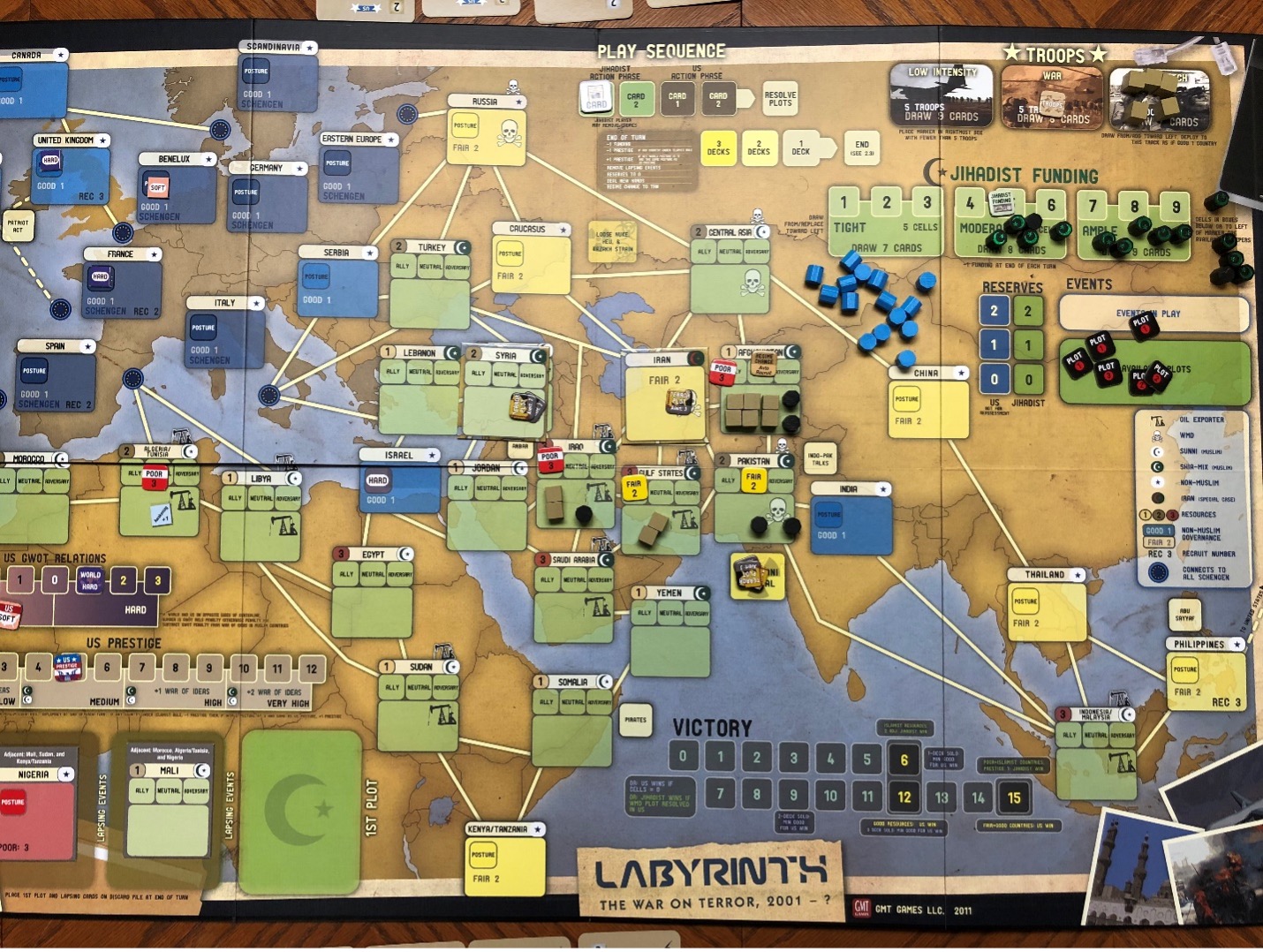 The Jihadist player will usually want at least 5 cells in play. The US options are deadlier in Labyrinth: Awakening than the original game. If the Jihadist has fewer than 5 cells, (especially spread in only two countries) the US player could potentially eliminate them all and win the game immediately.