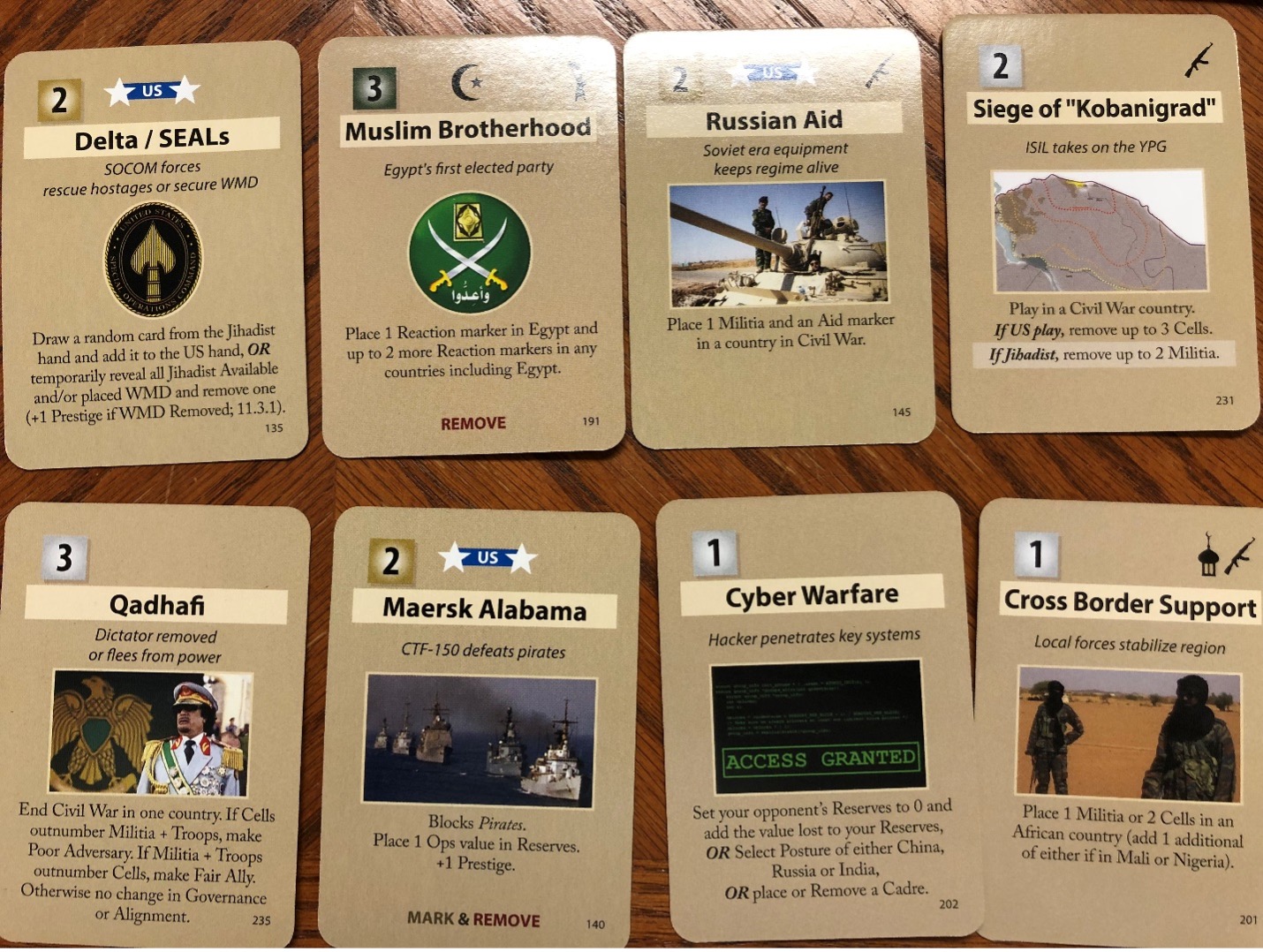 The US has one very bad event: Muslim Brotherhood. Placing 3 reaction markers is so devastating, the US player is likely to hold the card, and possibly discard it. Delta/Seals is very strong early, netting a card and costing the Jihadist a card. The hand has many options for militia, but most of these are not playable events until a civil war breaks out.
