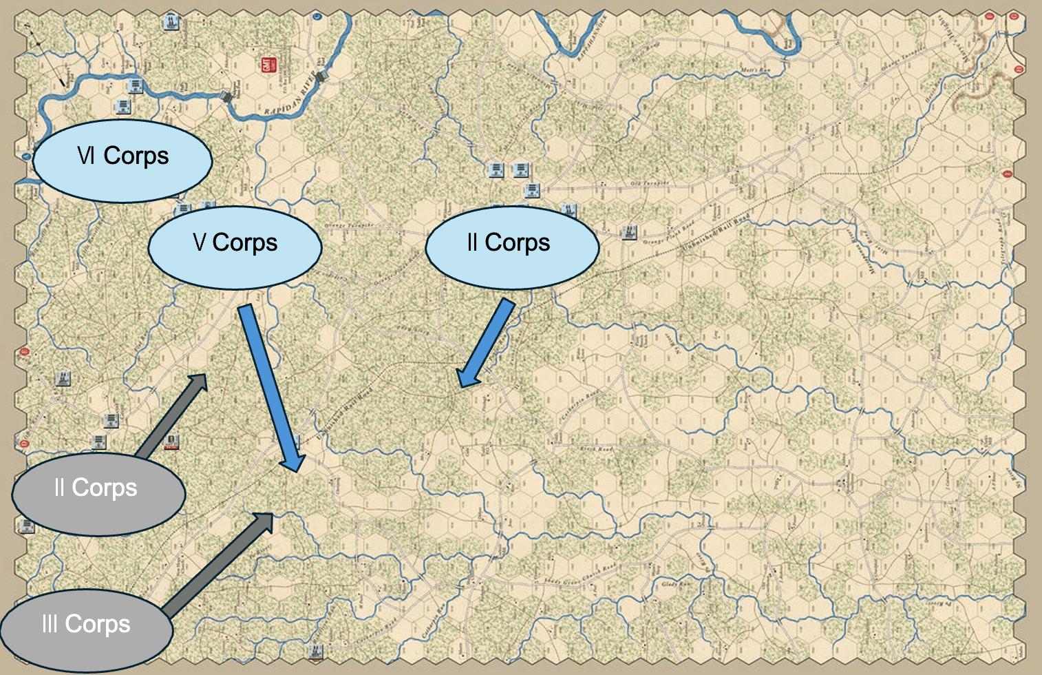 On May 5th, the Union army was arrayed as they are shown in the Wilderness scenario set up. The blue arrow shows the Union plan of operations to turn the Confederate right flank at Carpathian Road (hex 1012, entry A). The gray arrows show the Army of Northern Virginia’s initial probes along the Orange Turnpike (CSA IInd Corps) and Orange Plank Road (CSA IIIrd Corps).