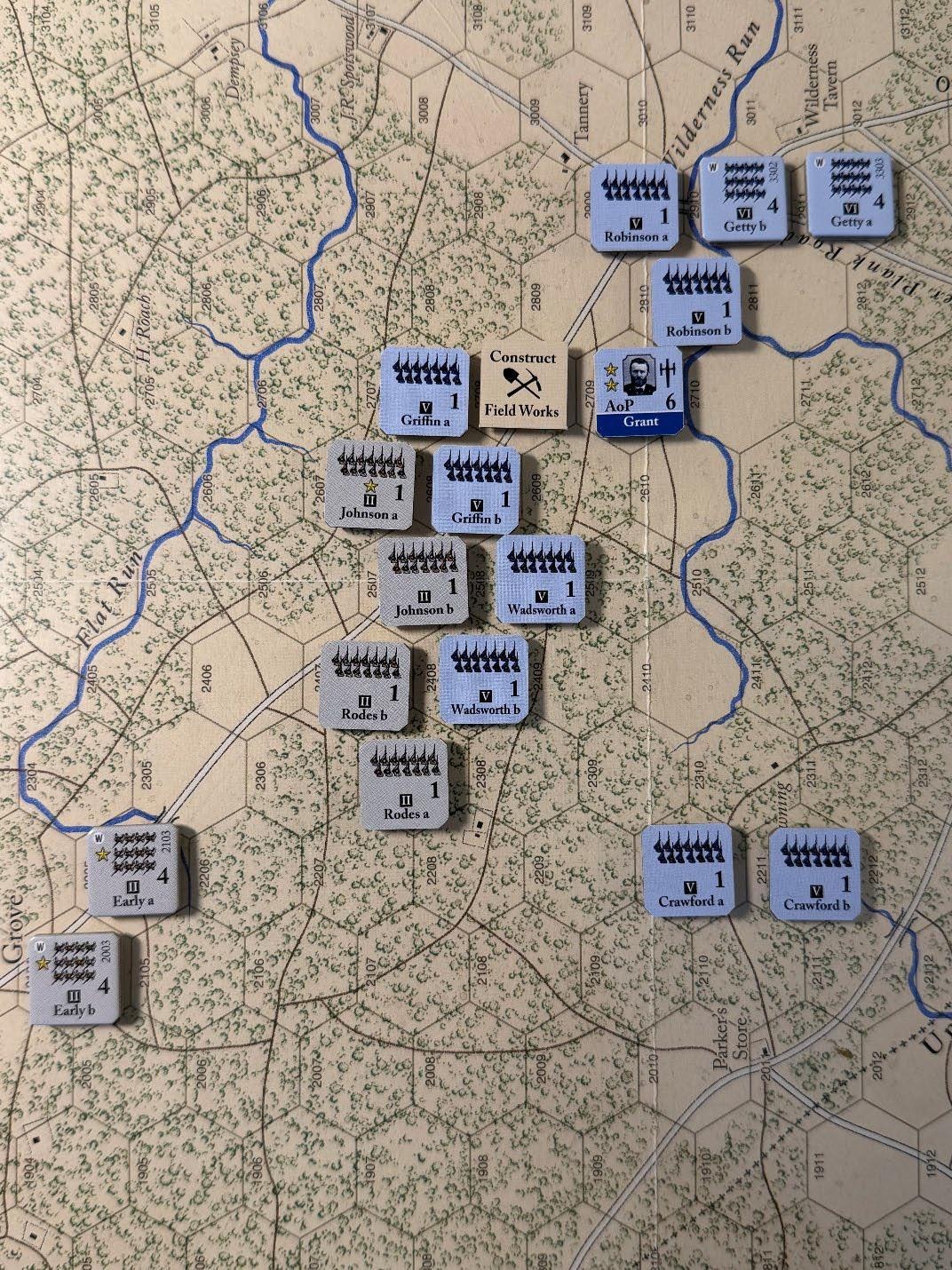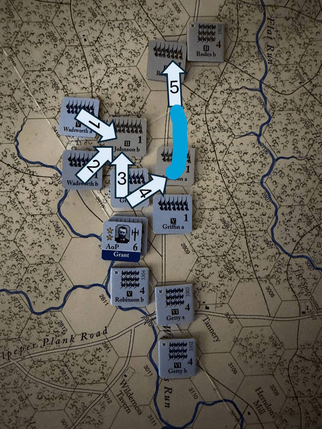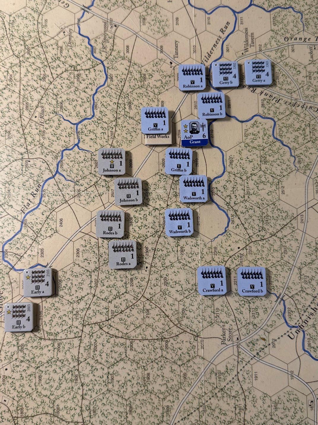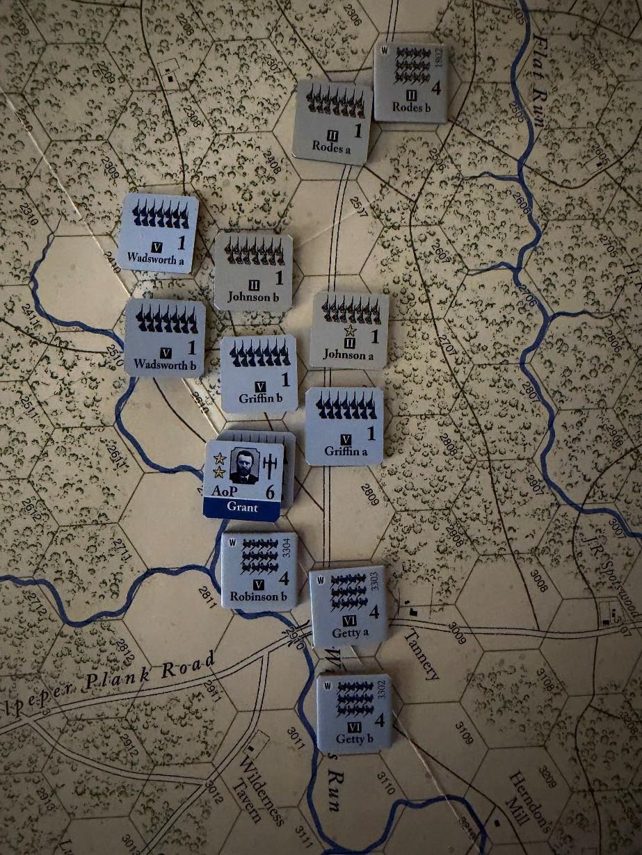 At 7:30 am on May 5th, General Meade, in command of the Army of the Potomac, reported to General Grant (located near Germanna ford hex 3401) that he was halting the army’s advance and deploying to launch an immediate attack on the Confederate advance. Grant readily agreed, but by 10:30 am (turn 1), General Warren, Vth Corps commander, had yet to organize an attack primarily because Generals Griffin and Wadsworth refused multiple direct orders to attack.