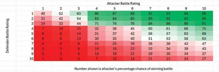 The above table calculates the probability of combat success for any combination of attacker and defender tactical position ratings. Results highlighted in green represent a 50% chance or better of success, whereas results in red represent less than 50% chance of success. The color gradations give you a visual sense of how much above or below 50% a given probability represents numerically. The colors should make it clear that there are several breakpoints in the combat system, but the main one is you should always try to attack at a tactical rating equal to the defender as that generally represents, like baseball, a one in three chance of success.