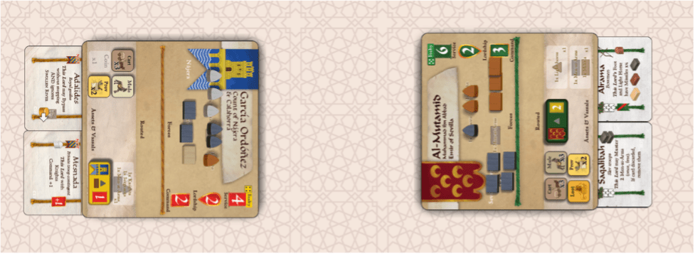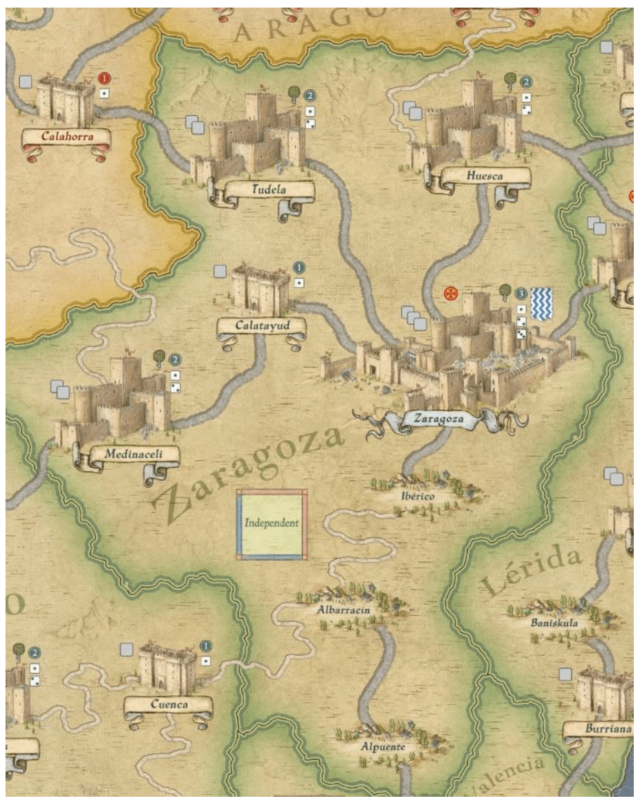 The Muslims decide to Levy Rodrigo as soon as possible, paying 3 Coin for that, putting his Seat at the Fortress of Tudela, in the Zaragoza Taifa near the Leonese border. (Rodrigo is the famed mercenary El Cid. Historically, he served the Emir of Zaragoza during these years but is not known to have seen action. In the game, the Muslim player is able to grant Rodrigo a Seat at Tudela because that Locale has become friendly to the Muslim side, rather than neutral, through Muster of al‑Mustain of Zaragoza, not yet shown above, to join al-Mutamid against Alfonso.)