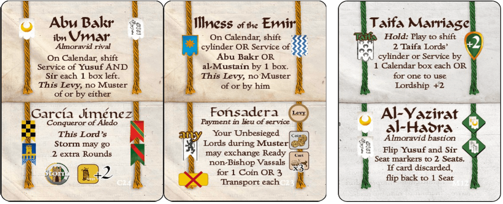 As ILLNESS OF THE EMIR puts al-Mustain was in danger of Disbanding right now, the Muslim player has to use the TAIFA MARRIAGE card that he had been holding to extend al-Mustain’s military resistance by another 40 days (shift his Service forward on the Calendar by 1 box).