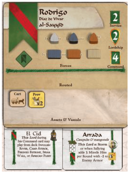 Playing the SWOLLEN RIVER held Event card to block Rodrigo from Avoiding Battle, the Christian army is able to force the fight againstRodrigo. And, since Alfonso has the intitiative (it’s not Rodrigo’s Command card), the Cid will not be able to pull any of his special tricks (per card text at lower left of Rodrigo’s mat, shown above).