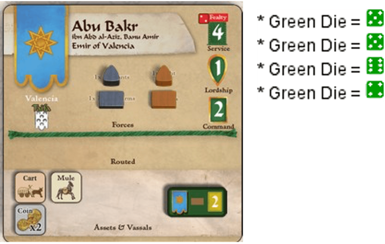 The Muslims, in a desperate attempt to gather some more forces to defend Zaragoza, strain with all of their available Lordship (dimished by the ABU BAKR IBN UMAR Event) to Muster Valencia’s Emir, Abu Bakr of the Banu Amir. But with his Fealty rating of 2 (shown by the red die icon at his mat’s upper right), they will need some luck to persuade him … which does not come.