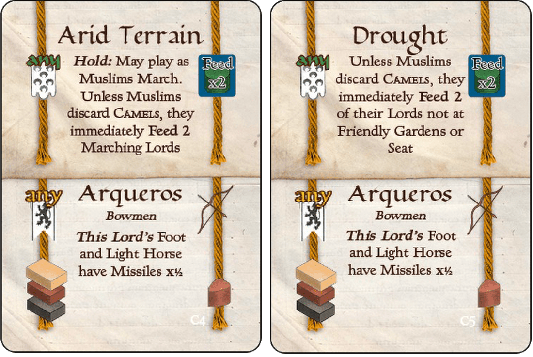Then disaster strikes the Christians mid-Summer. The Muslim player draws the Event DROUGHT (curtailing Service of Christian Lords that cannot meet the unplanned need for Provender). The King had just spent the Coin from al‑Mustain’s Parias tribute to pay his Lords, so he has none to extend hishousehold’s Service and Disbands.
