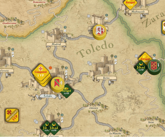 Riposte. Yusuf’s retaking of Toledo reverses not only the Christian conquest of that city the previous year but also enforcement of Alfonso’s claim to Toledo Taifa as a Christian province. (Replacing Christian Conquest markers with Muslim Jihad markers plus resetting the Taifa from Reconquista to Parias status, minus flipping damage from Ravage there to now credit the Christian side, yields a whopping swing of 6 VP to the Muslims.)
