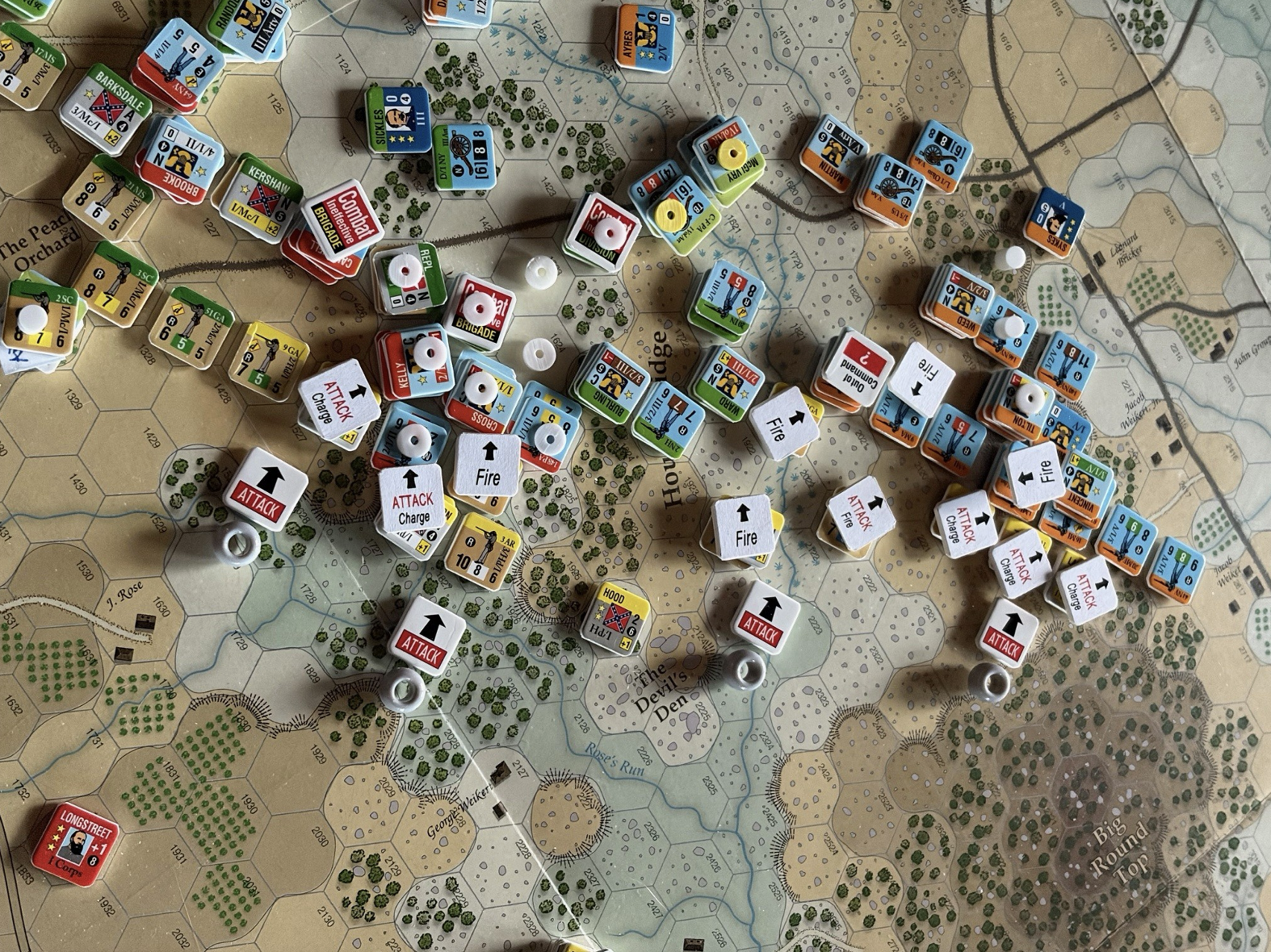 This article contains merely an outline of how SGBACW works; the historical design rationale will be included as part of the Designer’s Notes included in Three Days of Gettysburg – Deluxe Edition. Other features of Civil War combat not mentioned include: breastworks construction, night fighting, mounting and dismounting cavalry, abandoned artillery, and artillery bombardment. A section of optional rules add even greater depth, including Green Units and Extended Lines, but are not essential to enjoy SGBACW.