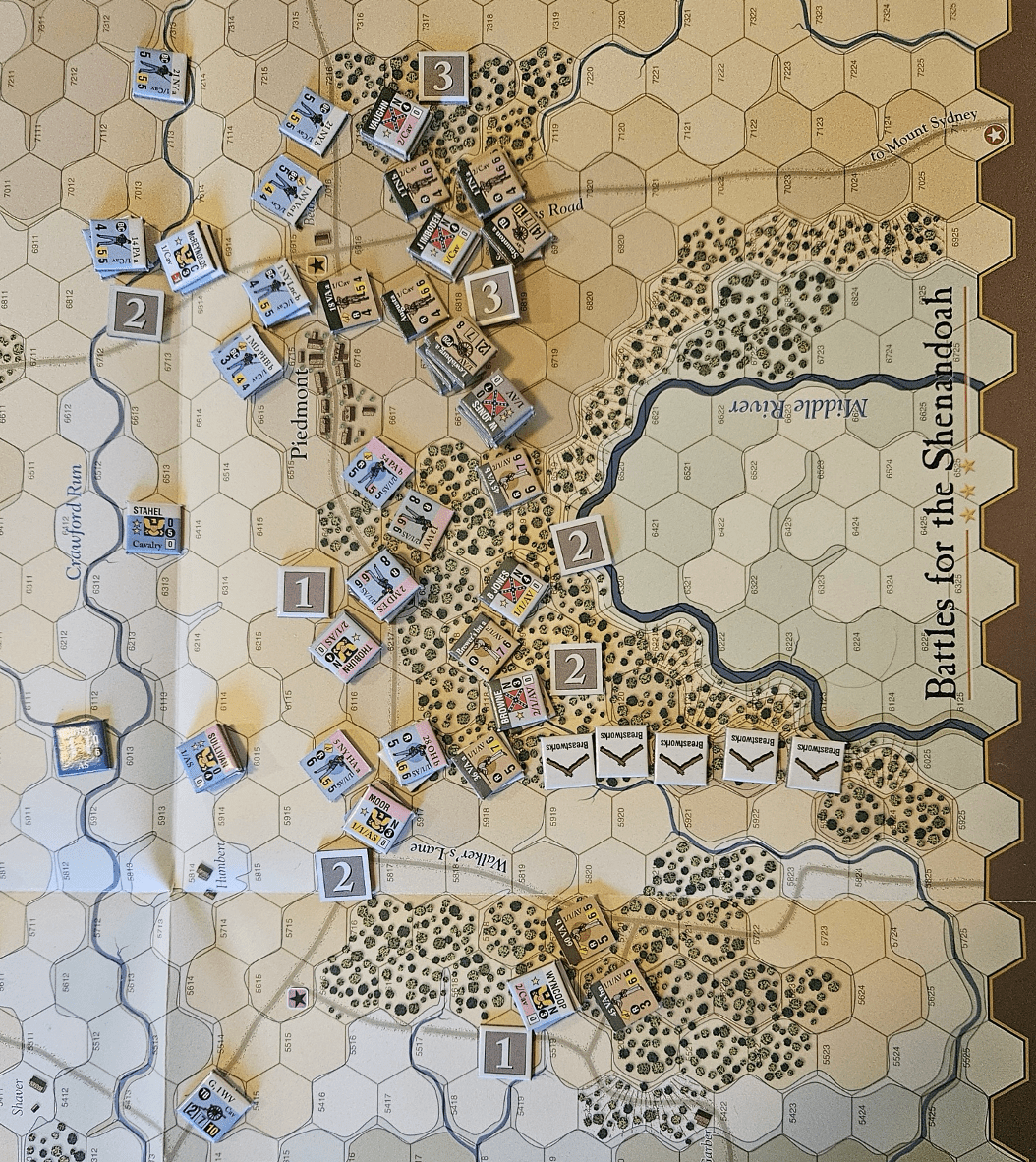 After combat for the division is resolved, both the phasing and the non-phasing players conduct attrition. If an infantry or cavalry brigade has 7 or more SP Losses, the player must remove units of that brigade from the map, subtracting the units’ strength from its brigade’s SP Loss total, until the brigade has fewer than 7 SP Losses. When at least half of the units of a brigade are routed, the brigade becomes Combat Ineffective with appropriate penalties to its units. Divisions become Combat Ineffective as when at least half of its brigades becomes Combat Ineffective.
