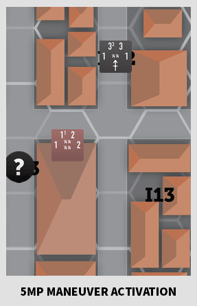The last player action, Maneuver, is intentionally the most flexible. The results of Maneuver resolve rolls can provide the player with a number of Maneuver Points (MP). They must first spend MP to move the activated units to at least one hex. Anytime after the first hex they can choose to continue moving or stop and spend their remaining MP to take one of the other two actions.