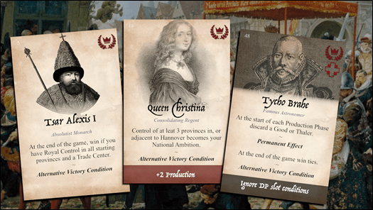 If the game lasts until the end of the final Round (which can be either Round 8, 12 or 16, depending on what game length the players chose), Prussia will win if they control both their starting areas (Königsberg & Brandenburg), as they will have succeeded in Maintaining the Balance of Power. This is a balancing mechanism to compensate for the fact that Prussia’s position is far weaker than the other powers, and thus will likely find it very hard to achieve the Cultural Hegemony or Monopoly on Trade victory conditions, but it also neatly represents history. For Prussia, a minor power in the region, it was important to maintain the balance of power between the other states to prevent any of them from steamrolling Prussia, and to create situations where Prussia could take diplomatic or military advantage of the rivalry between their stronger opponents, thereby opening opportunities for their later growth to great power status. As one of Prussia’s special rules (besides the Polish Vassal status described earlier) is greater control over the independent powers, this victory condition also aligns nicely with the historical goals of the major powers on the fringes of the Baltic (the Ottomans, Habsburgs, English, French, and Dutch), as they too sought to maintain a balance of power in the region to better further their own interests in the region.